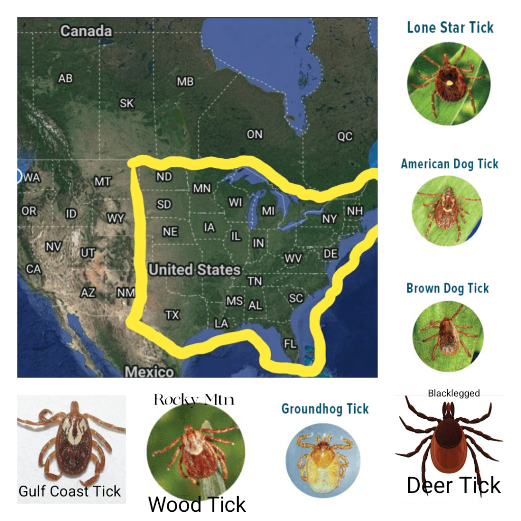 There are 7 types of ticks native to the Eastern US that will give humans infections.
